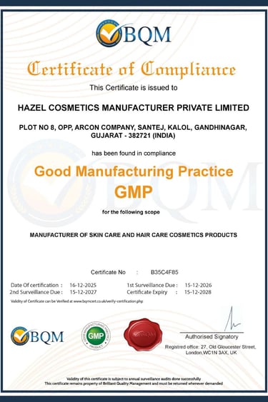Hazel Cosmetics Manufacturer Private Limited is proud to be a GMP Certified company, demonstrating our strong commitment to quality, safety, and regulatory compliance in cosmetic manufacturing. GMP Certification ensures that all our products are manufactured in a hygienic environment, following strict Standard Operating Procedures, quality control measures, and documented processes. From raw material selection to final packaging, every stage is carefully monitored to maintain consistency, effectiveness, and safety. This certification strengthens our capability to deliver reliable private label, contract, and third-party manufacturing solutions that meet both national and international cosmetic standards.